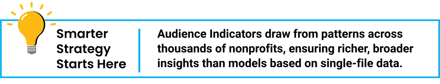 With the additional goal of acquiring new monthly donors, Data Axle incorporated Audience Indicators to identify prospects likely to become sustainers. Audience Indicators take a comprehensive view of data from thousands of nonprofits to identify donors who fall into specific categories, rather than relying on custom modeling that pulls from a limited pool of donors.